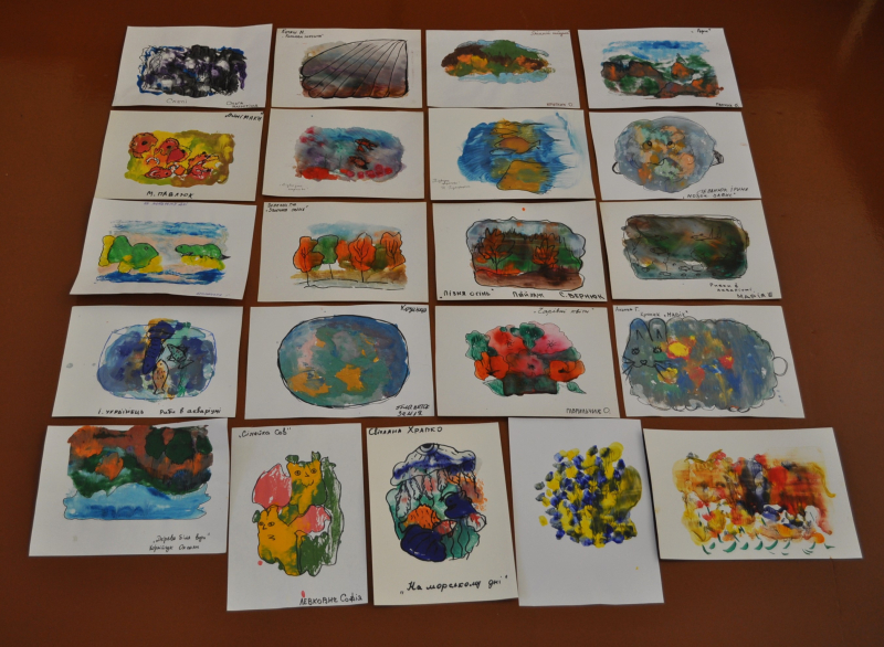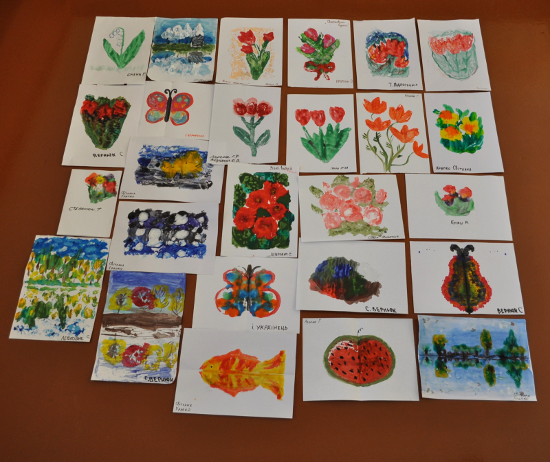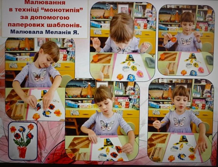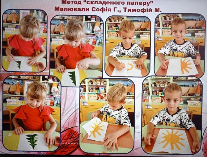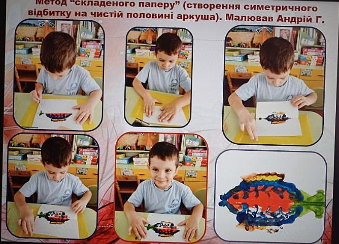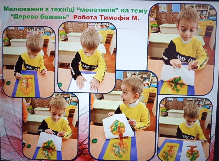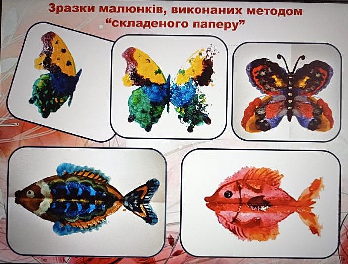 - створити монотипію: «Що ти бачиш у цій плямі? На що вона схожа? Домалюй так, щоб інші теж це побачили»; потім, повертаючи її під різними кутами, домалювати різні образи.