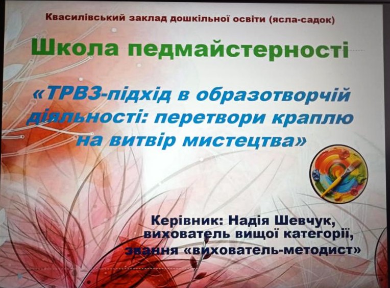 13.11.2025 у Квасилівському ЗДО відбулася школа педмайстерності Надії Шевчук "ТРВЗ-підхід в образотворчій діяльності: перетворюємо крапку на витвір мистецтва" Мета заходу: ознайомити педагогів з основами ТРВЗ-педагогіки та її застосуванням в образотворчій діяльності; розвинути креативне мислення, навички нестандартного розв'язання творчих завдань та вміння перетворювати прості елементи на складні художні образи.