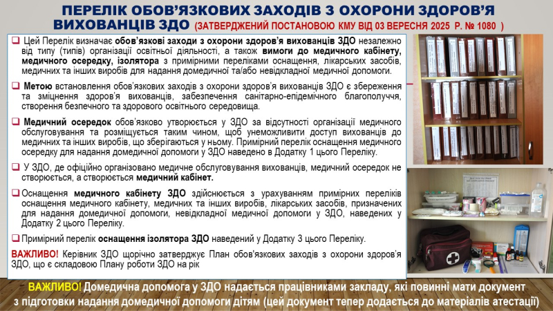 2.1. Оснащення медичного осередку в ЗДО для зберігання медичних та інших виробів для надання домедичної допомо-ги вихованцям ЗДО. Співдоповідь з презентацією медичного осередку